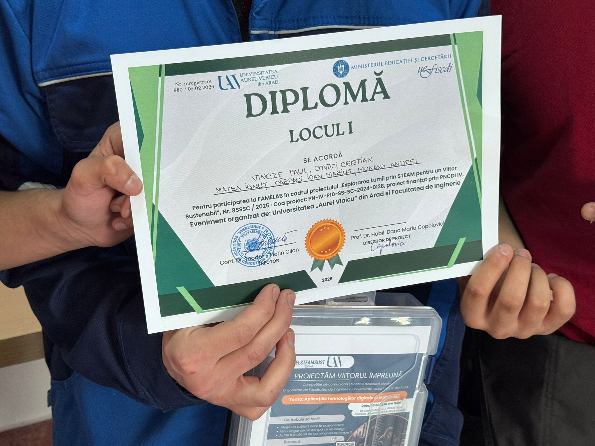 Echipa formată din Vincze Paul, Covaci Cristian, Matea Ionuț, Cârpaci Ioan Marius și Mokany Andrei au obținut primul loc la FAMELAB, în cadrul proiectului ”Explorarea lumii prin STEAM pentru un viitor sustenabil”, eveniment organizat de Universitatea ”Aurel Vlaicu” din Arad și Facultatea de Inginerie.